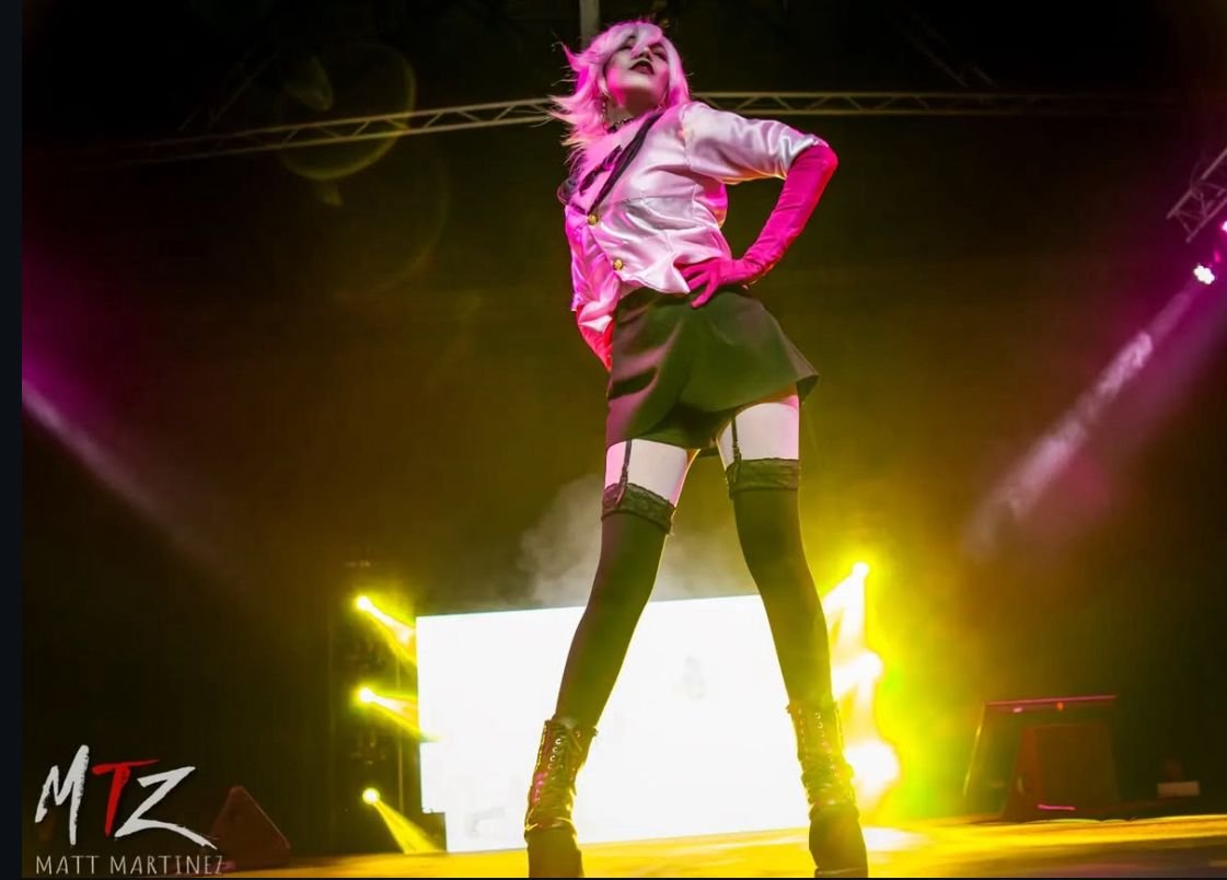 Ella es fan de Hazbin Hotel desde que salió el webcomic en 2015. Se siente identificada con Angel Dust y la verdad lo podemos notar con su bello cosplay. También debemos destacar su gran idea de agregar accesorios, brillos y texturas, que debido a su naturaleza extravagante usaría.