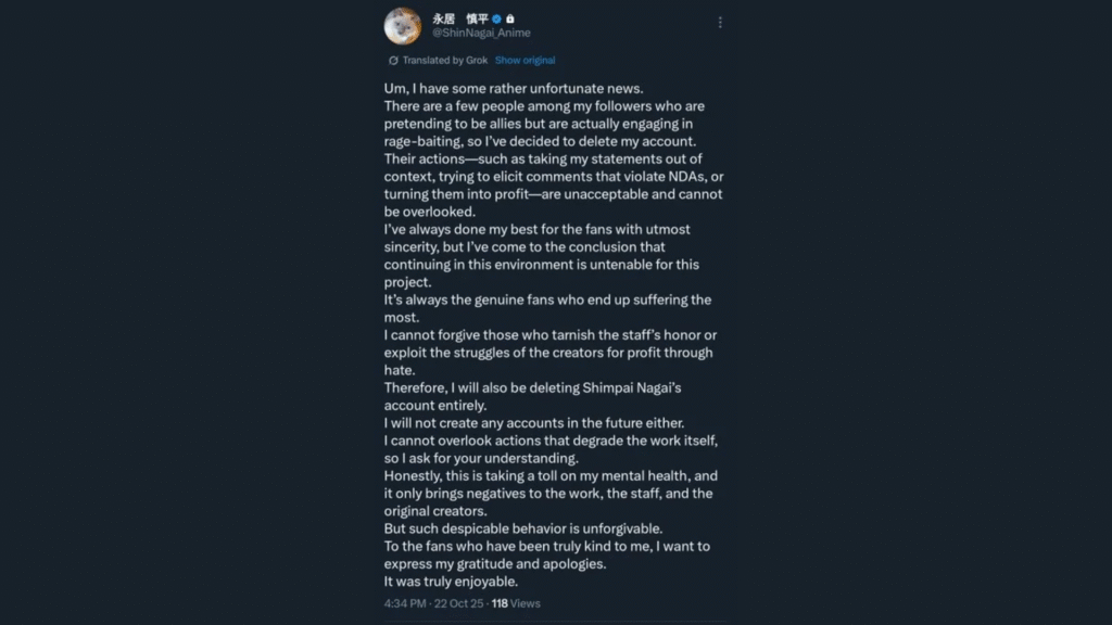 “Siempre he hecho lo mejor por los fans con la mayor sinceridad, pero he llegado a la conclusión de que continuar en este ambiente es insostenible para este proyecto. Siempre son los fans genuinos los que terminan sufriendo más. No puedo perdonar a aquellos que empañan el honor del personal o explotan las luchas de los creadores con fines de lucro a través del odio. Por lo tanto, también borraré por completo la cuenta Shinpei Nagai”.