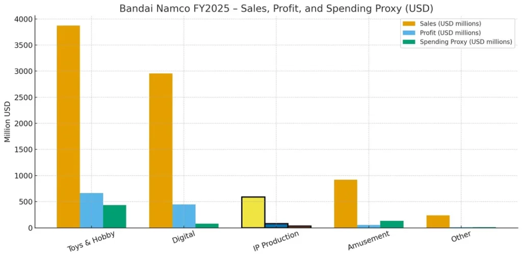 Bandai Namco forma parte de la producción de la serie ya que posee la propiedad intelectual de la franquicia. Los últimos reportes de la empresa registran la importancia que le dan a One Punch Man: estos indican que lo que más ganancias genera para ellos son los juguetes (USD 3.9B); luego siguen los juegos digitales y los servicios de entretenimiento (USD 3B y 900M), relegando los ingresos provenientes del anime a tan solo USD 500 millones. Es decir, que para Bandai Namco es más rentable vender juguetes o videojuegos que realizar una producción animada de alguna de sus IP, como One Punch Man.