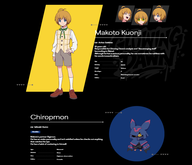 Makoto Kuonji: El más joven de todo «Glowing Dawn», con 10 años es el encargado del análisis de datos del equipo. Posee una personalidad seria, aunque a veces puede ser medio ingrato con lo que dice. Su seiyuu será: Arisa Sekine.