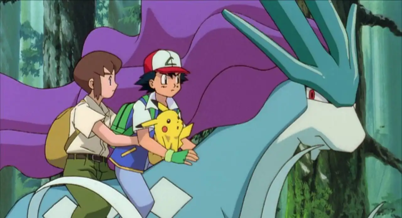 Luego pasamos a ver a nuestros héroes que tienen que tomar un barco, pero se retrasan porque Ash está en medio una batalla. En el viaje, conocen a un chico que los invita a su pueblo. En medio, Pikachu ve a Suicune en el bosque, y al consultarle al profesor Oak, él les cuenta que es un Pokémon legendario y que no se sabe mucho acerca de él. Pero les comenta que se cree que tiene el poder de purificar el agua sucia.